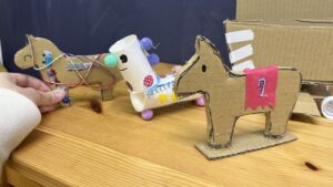 教室の中で、制作した作品の紐を高く掲げて確認している男の子